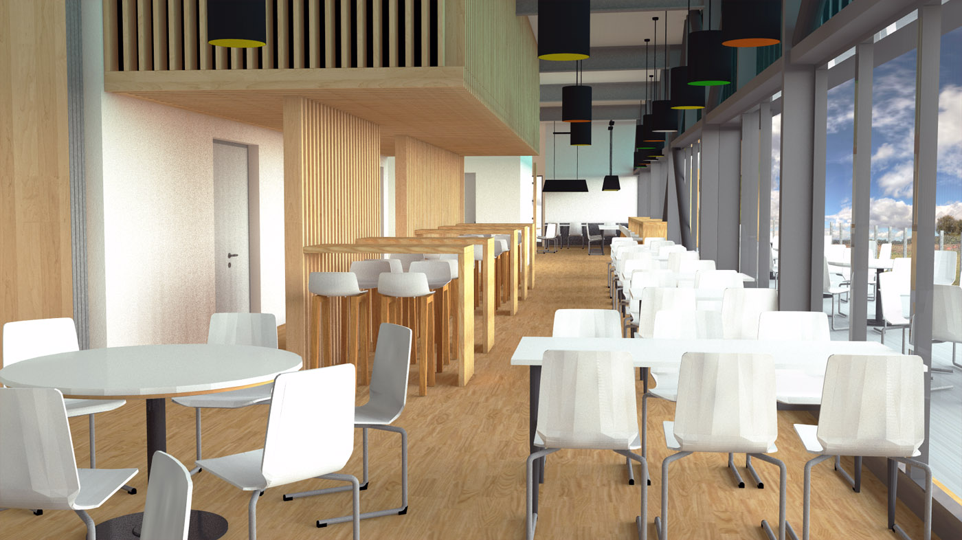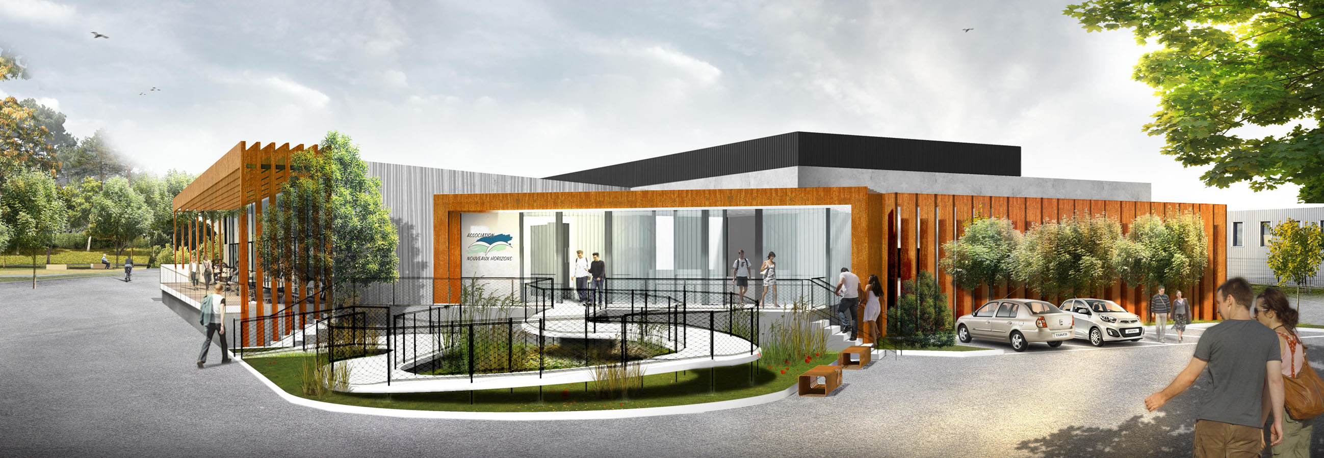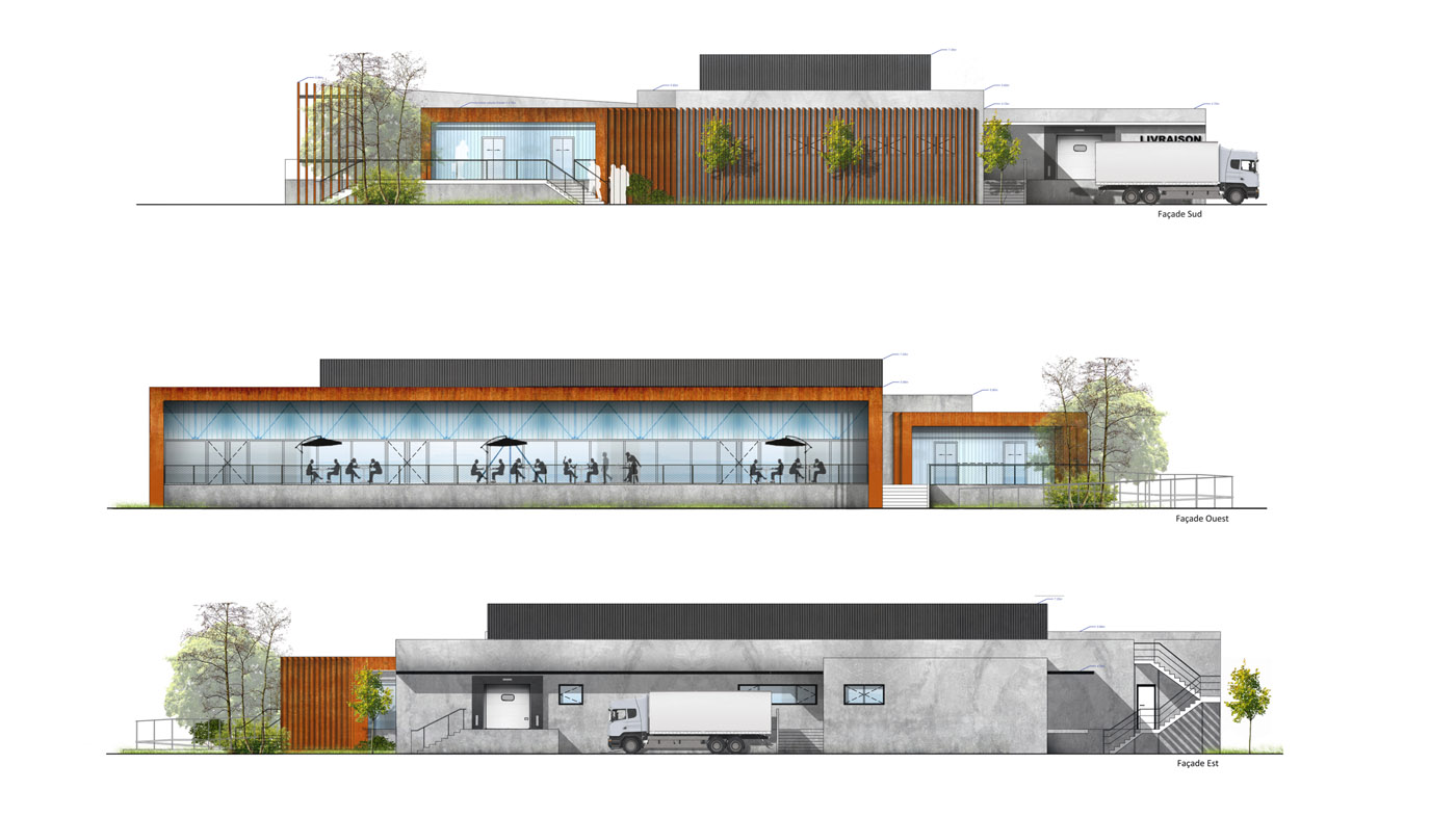 Notre conception des bâtiments s’est appuyée sur la technique constructive pour travailler les matériaux et leur intégration dans le site. En effet, le volume principal de la cuisine en RDC est composé de deux volumes perpendiculaires qui se croisent. Ces deux volumes proposent des hauteurs intérieures sous faux plafonds identiques mais extérieures différentes de façon à jouer sur les volumes mais également de façon à proposer des interactions entre les espaces, et donc de permettre des interfaces de fonctionnement entre les différentes zones.